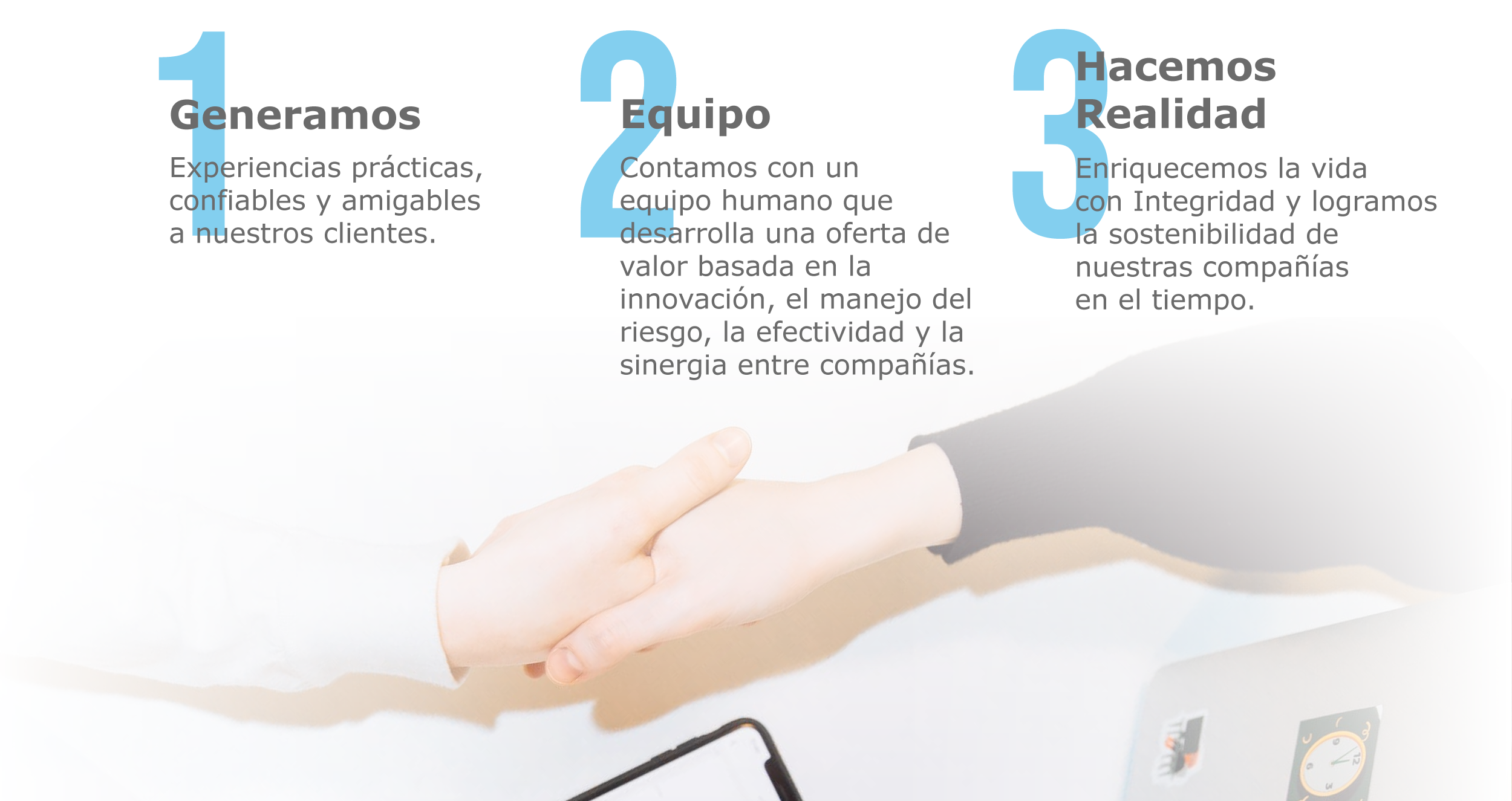 Generamos valor a nuestros clientes, comunidad e inversionistas, a través de un equipo humano íntegro, comprometido, amigable y siempre dispuesto a crear con cliente soluciones a la medida sostenibles en el tiempo.