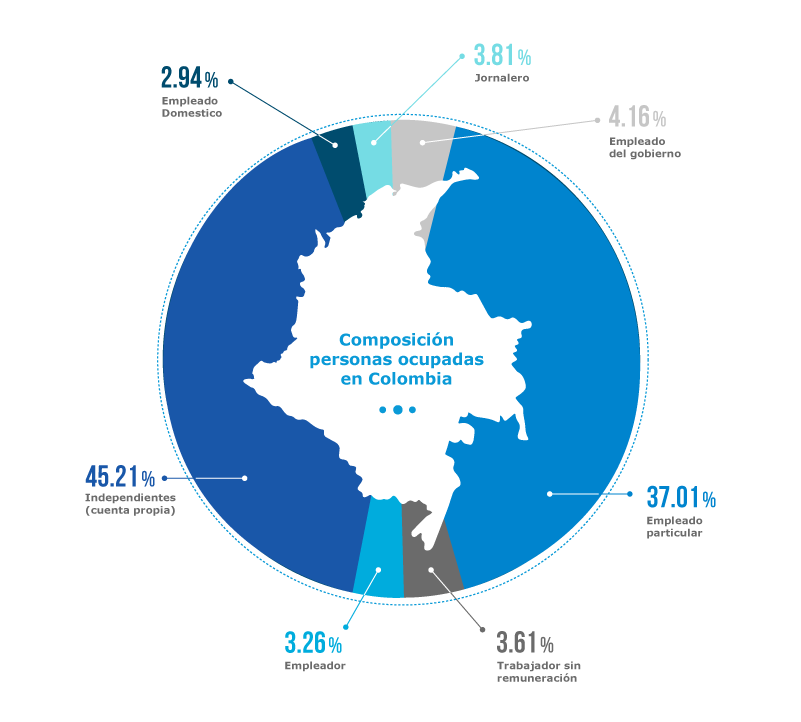 En un análisis simple, se ve que Colombia tiene una población muy alta en el rubro de independientes o por cuenta propia (informales), que, sumados a trabajadores sin remuneración, se llega al 49% de la población económicamente activa en economía no formal desprovisto de seguridad social para la gran mayoría de este grupo. Esta composición pone a Colombia en niveles de muy mala calidad de empleo y en altísimo nivel de vulnerabilidad ante situaciones y circunstancias como los que derivaron de la pandemia, donde cerca del 50% de la población económicamente activa vio reducido su ingreso a cero o niveles muy inferiores a sus ingresos anteriores.