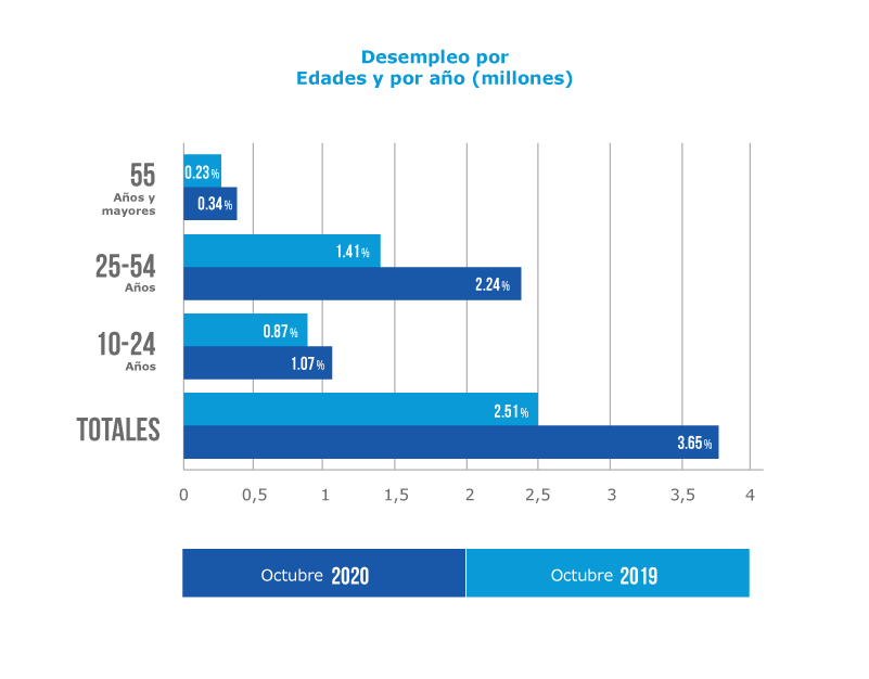 En la población de 25 a 54 años la tasa de desempleo en octubre de 2020 arrojó la cifra de 2.24 millones frente a 1.41 millones en 2019, con un incremento de 59%.