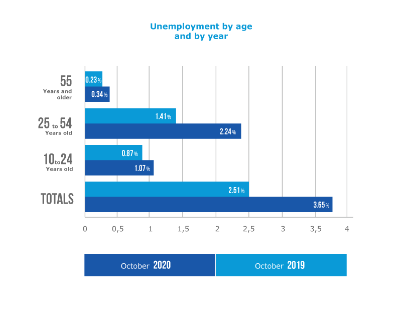 By age, unemployment in Colombia grew between 2019 and 2020 in October of each year by 45.4%, becoming much more critical in the young population where figures of the order of 25.0% are reached.