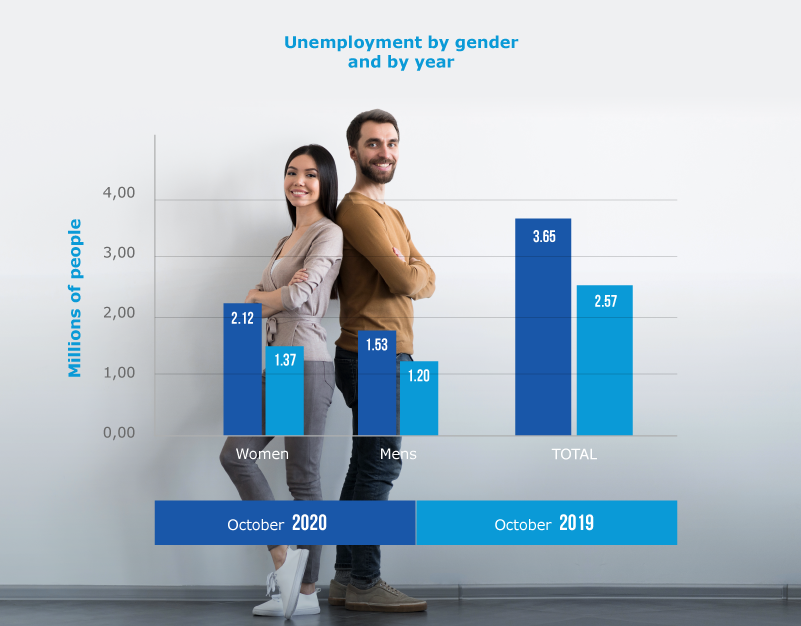The female gender has an unemployment of the order of 38.6% higher than the male gender, which together with the inequity in remuneration puts women in a particularly critical situation. In 2020 compared to 2019 (as of October) it reflects a growth in unemployment of 42%.